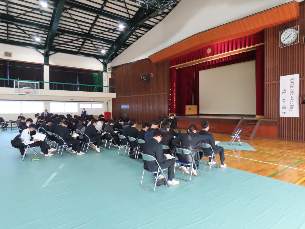 1月23日(水)、2年生を対象に、(社福)京都視覚障害者支援センター 理事等を務められている松永 信也様を招き、「誰もが共に生きる未来に向かって」をテーマに講演していただきました。